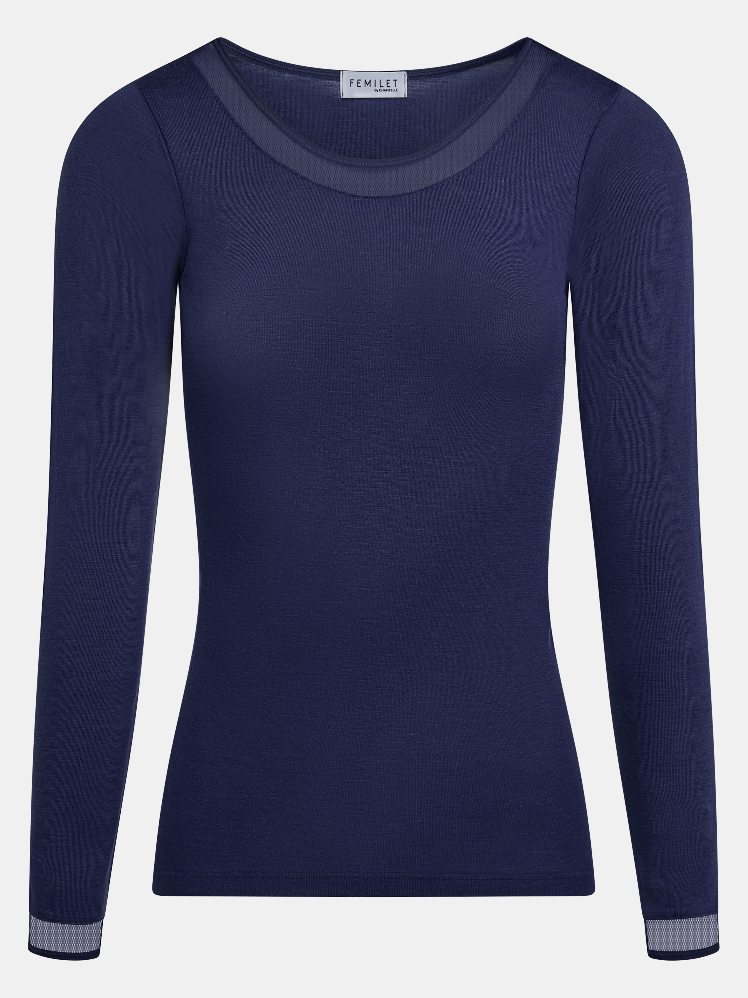 Langermet genser i myk ull med elegant meshkant i utringning og på armene. Produsert i 100 % merinoull som varmer når det er kaldt og puster når det er varmt.