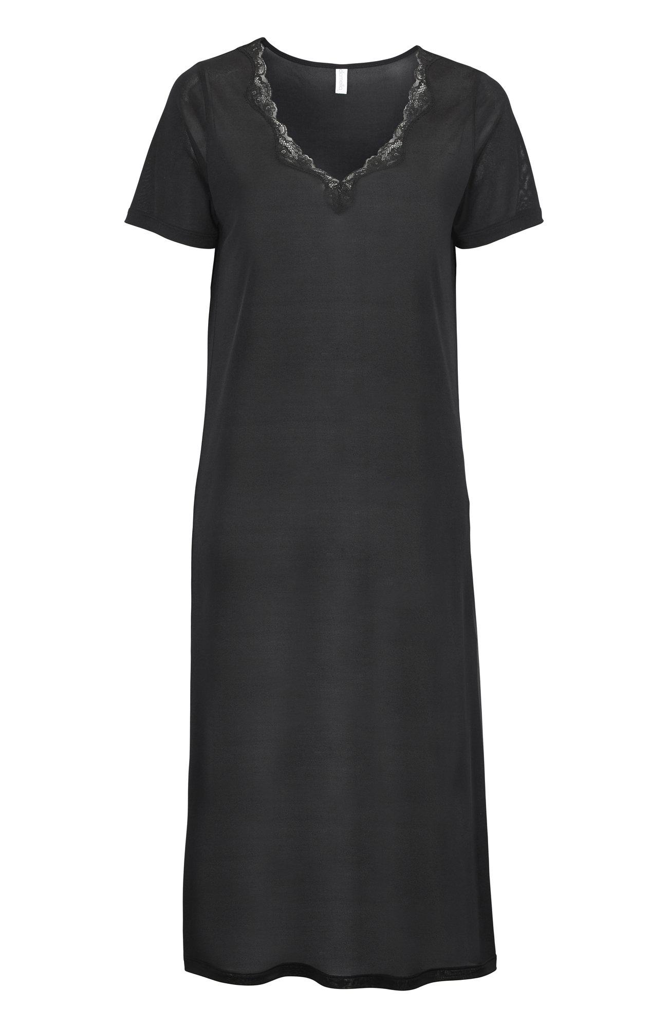 Fantastisk nattkjole i myk og behagelig silke fra Damella. Nattkjolen har en lengde på 110cm, har korte ermer og en elegant v-hals med blonde-kant. Nattkjolen har en avslappet passform og er laget i strikket silke, et materiale som er lett og mykt, samtidig som det har mye stretsj og føles fleksibelt. Stoffet absorberer fukt bra, er svalende i varmen og varmer når det er kjølig. Perfekt nattkjole alle årstider.